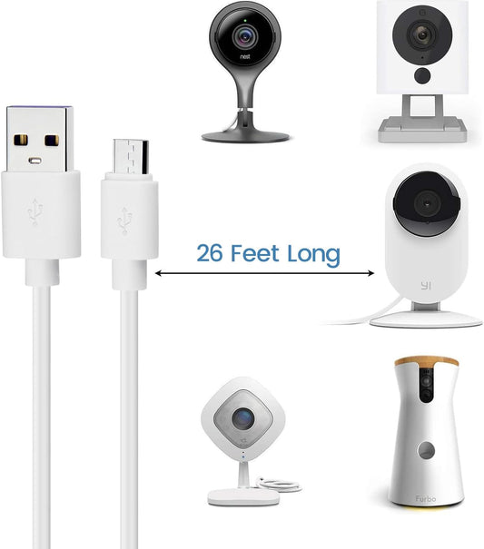 Micro USB Extension Cable Replacement for Wyze Cam V3 or Pan V2, Yi Outdoor Camera - Long Power Cord 25 Ft, White, 3-Pack